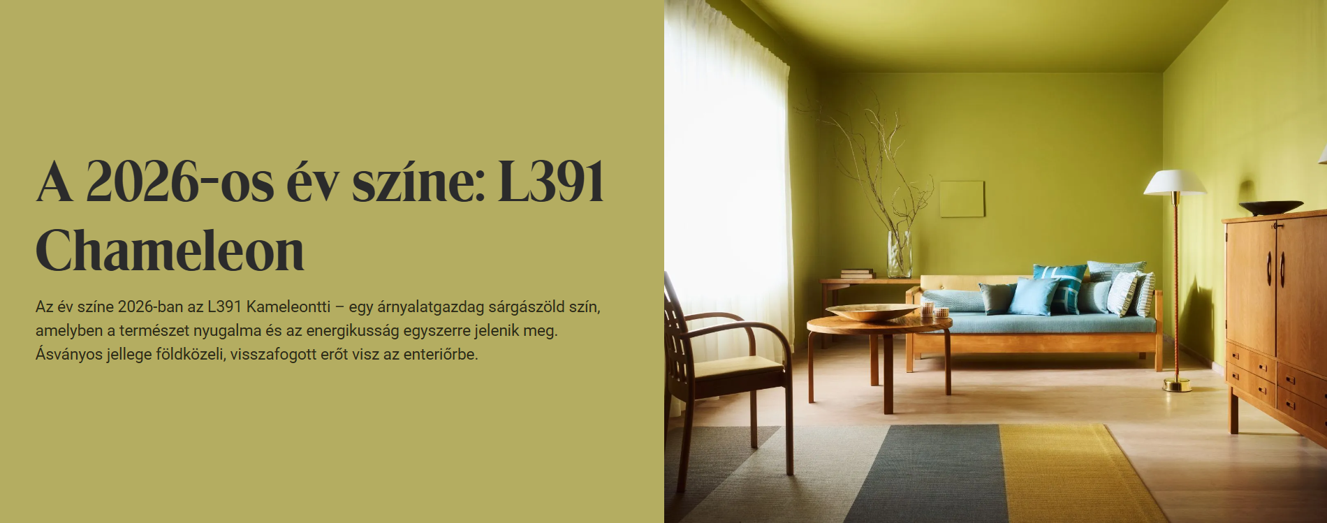 Az aranyfényű erdő egyszerre földel és felfrissít – ugyanezt az élményt hozza el az Év színe 2026-ban, a sárgászöld L391 Chameleon. Nézd meg, hogyan kapott új életet egy nappali és egy gyerekszoba, és meríts ötleteket a saját otthonodhoz!